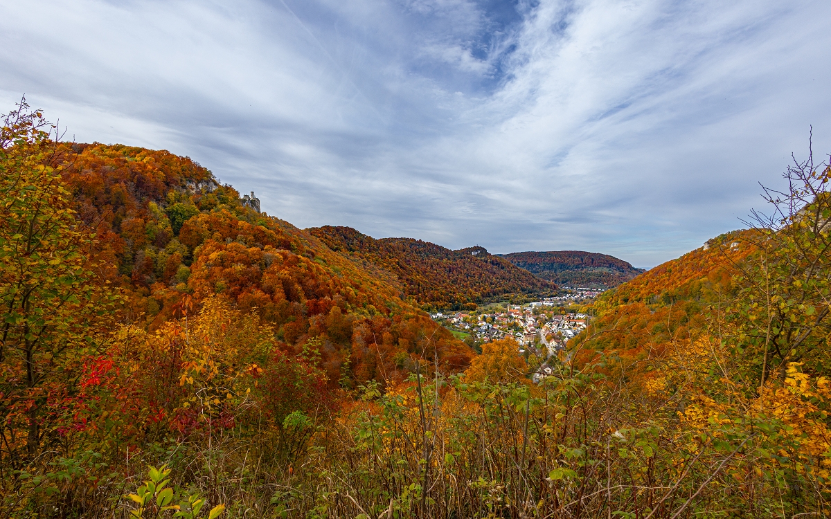 Unsere erste Station war der "Aussichtspunkt Lichtenstein" bei Traifelberg. Ein wunderbarer Blick quer übers Tal zum Schloss Lichtenstein und ins Tal auf die Ortschaft Lichtenstein.